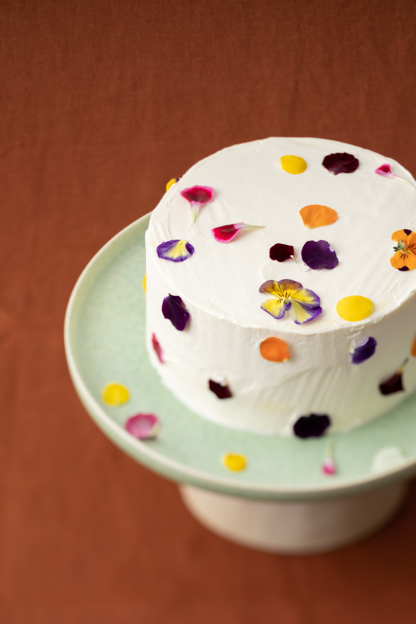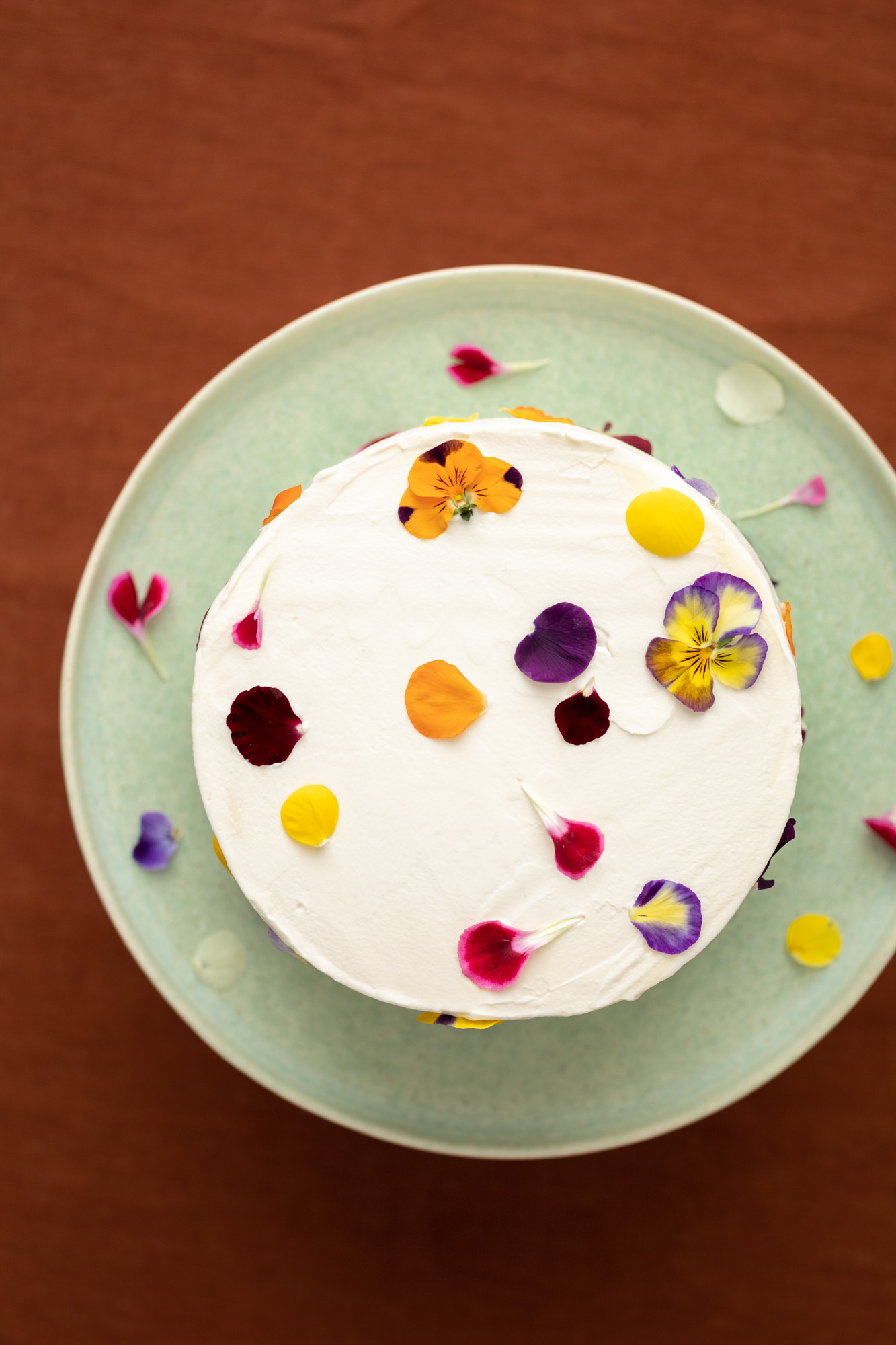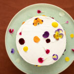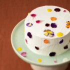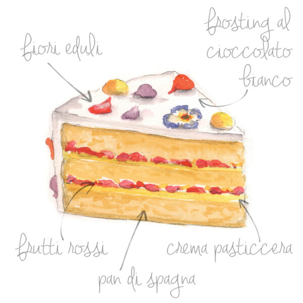 Pan di spagna, frosting al cioccolato bianco, fiori eduli, frutti rossi, crema pasticcera